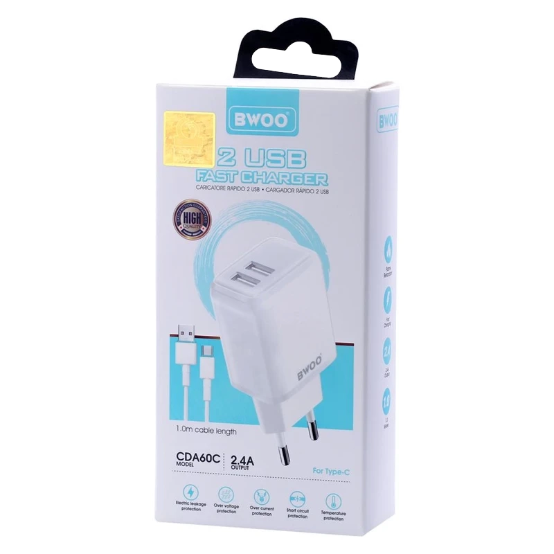 شارژر دیواری بوو (Bwoo) مدل CDA60C و کابل تبدیل USB-C ساخت کشور چین می باشد.
